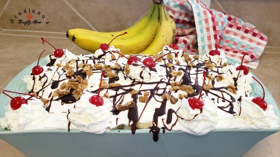 Grease and flour a 9x13 inch baking dish. Serve with sliced bananas on top. Preheat oven to 350o and grease and flour a 9 x 13 cake pan.